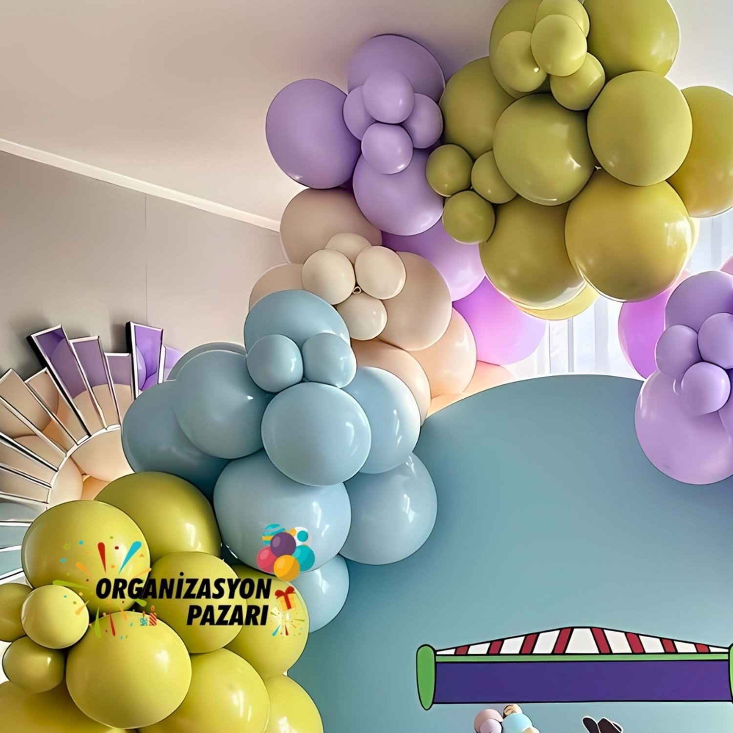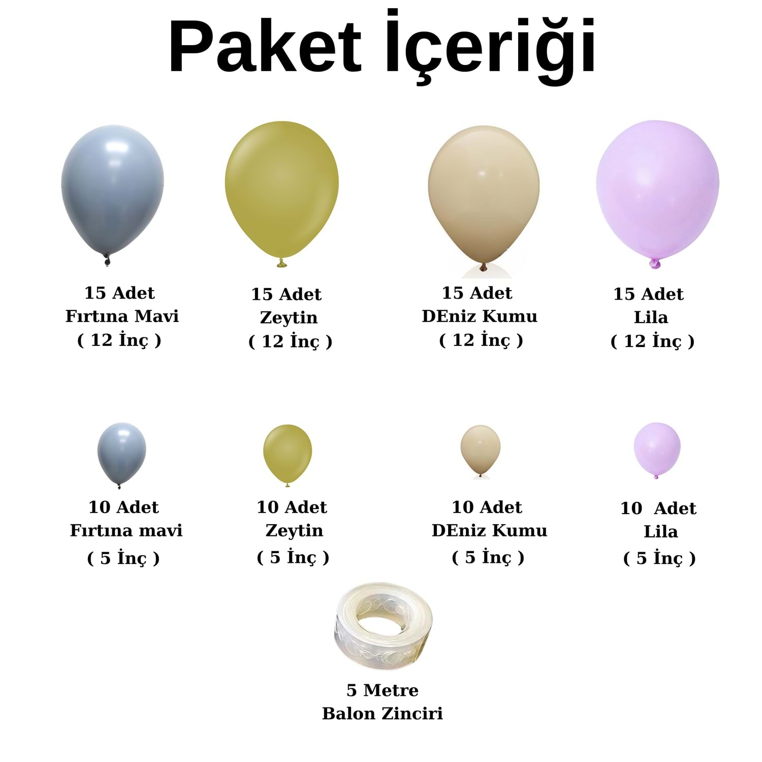 Balon seti fırtına mavisi - zeytin - deniz kumu - lila 100 lü balon zinciri seti Doğum günü partinizi, 1 yaş doğum günü süsleri ya da hastane odası süsleme ihtiyaçlarınızı karşılayan bu eşsiz balon seti ile unutulmaz kılın. Balon zinciri ile muhteşem bir görsel şölen yaratın ve partinizin havasını değiştirecek bu şık setle fark yaratın!
