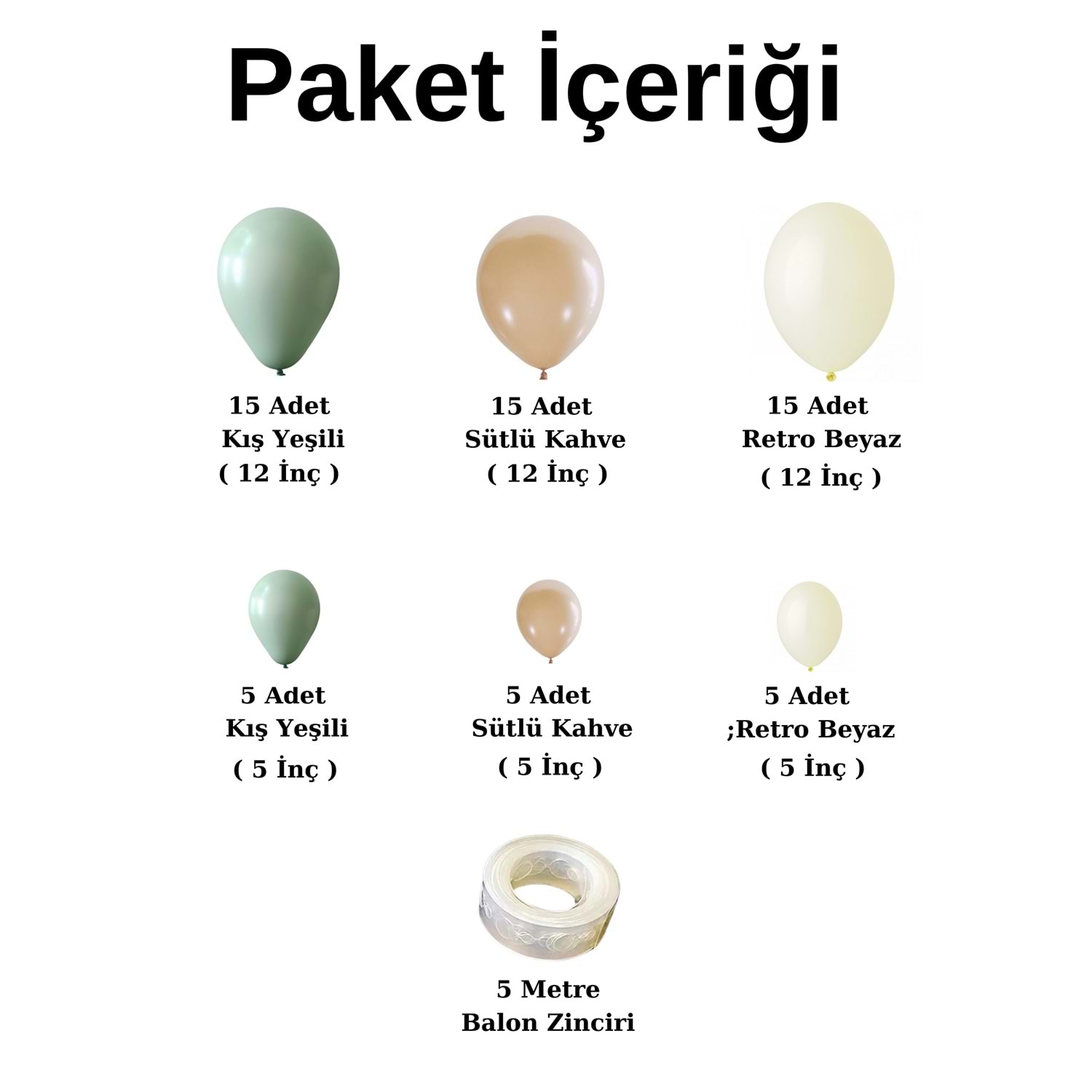 Öne çıkan özellikler: * retro kış yeşili - retro beyaz - pastel sütlü kahve renklerin eşsiz kombinasyonu, * 60 adet balon içeren eksiksiz bir balon zinciri seti, * Basit kurulum ve göz alıcı sonuçlar, * Doğum günü parti seti malzemeleri ve dekorasyon için ideal, Faydaları: * Doğum günü konseptinize mükemmel uyum sağlar. * Hastane odası süsleme ve çeşitli parti malzemeleri ihtiyaçlarınızı karşılar. * Kolay kurulum ile zaman tasarrufu sağlar. * Estetik bir görünüm ile misafirlerinizi etkiler. Ürün özellikleri: * Renk: kış yeşili - retro beyaz - sütlü kahve * Adet: 60 balon * Balon çapı: 12 inç ve 5 inç * Set içeriği: >>> 15 adet kış yeşili renk balon (12 inç ) >>> 15 adet retro beyaz renk balon (12 inç) >>> 15 adet sütlü kahve renk balon (12 inç) >>> 5 adet kış yeşili renk balon (5 inç) >>> 5 adet retro beyaz renk balon (5 inç) >>> 5 adet sütlü kahve renk balon (5 inç) >>> 5 metre balon zinciri ( balon bağlama aparatı ) * Malzeme: Yüksek kaliteli lateks